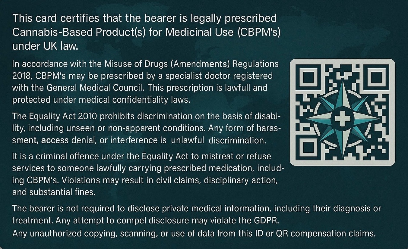 If challenged, simply scan the QR code on the card, it will verify the patient's active treatment status and immediately present a complete legal summary of all rights, protections, and penalties applicable for any interference or unlawful action.